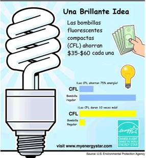 Por ejemplo, la bombilla compacta fluorescente que indica que brilla como una